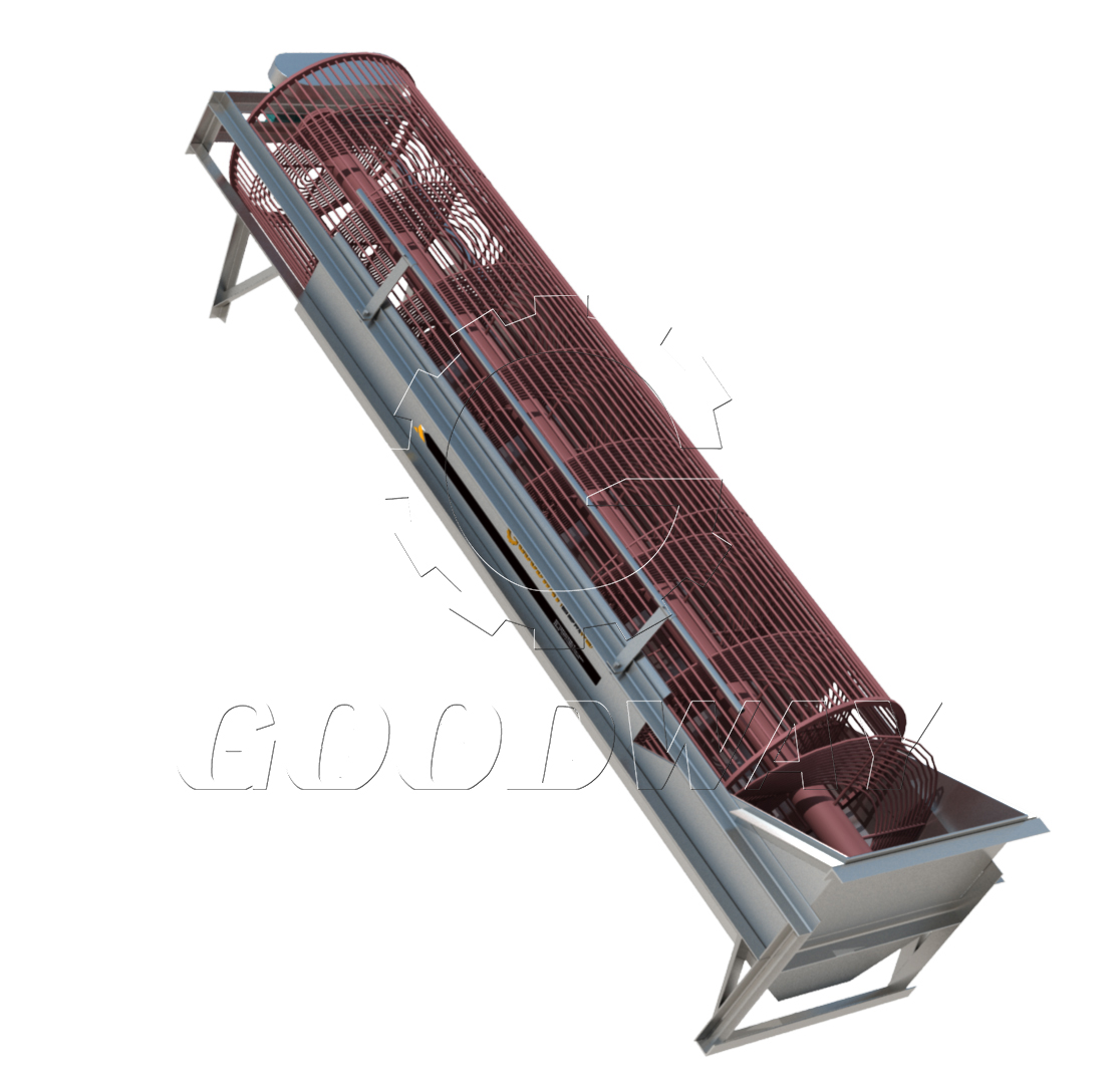 Long distance washing the materials by performing a circular motion along the wall of transmission drum, also a linear motion along the principal axis, to remove the pieces of peel, sand, silt, etc.